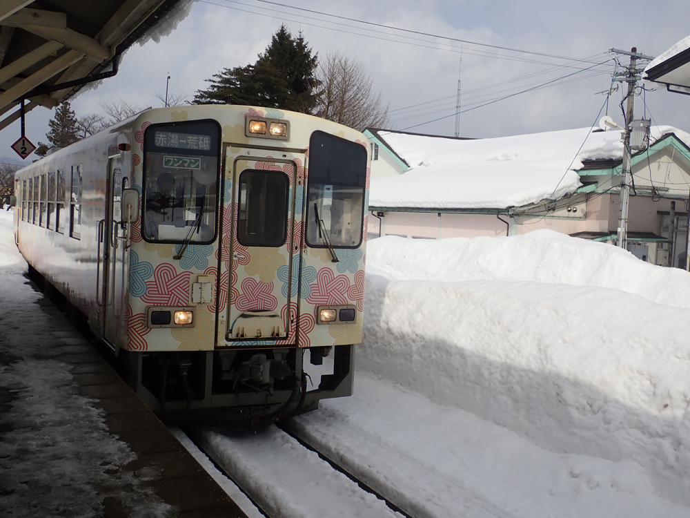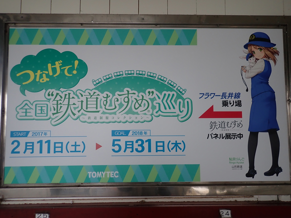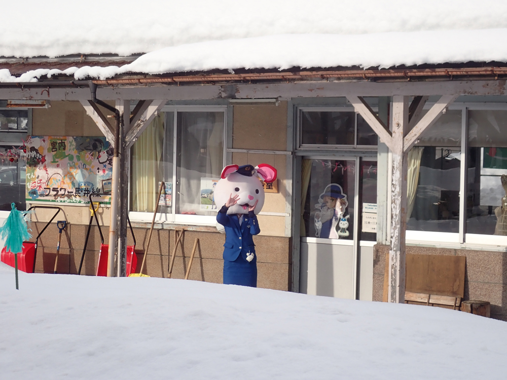 つなげて!全国"鉄道むすめ"巡り その17 山形鉄道 (完結) 山形はいったことないのでいつ行くか考え、雪多いところだしせっかくならと雪の時期を選択 しかし前の週に除雪車故障で運休・・・ 代わりにいつ行こうかと思っていたら無事再開 まずは乗り潰しのために荒砥駅へ 折り返して目的の長井駅 これで丸1年かけた「つなげて!全国”鉄道むすめ”巡り」を終了 そばを食べたり道の駅に行ったりと時間を潰しながら 今度はもっちぃに会いに宮内駅へ 初もっちぃ 後ろ向いていてこっち向いてくれない・・・・ せっかくのなので熊野神社にも足を伸ばす Googleの検索で進むとおかしなところに誘導されたが 小学校の近くに立て看板があり無事到着 うさぎ?当然見つからなかった双眼鏡か望遠カメラがほしいところ 駅員に見送られて赤湯に戻る 山形で泊まり翌日は仙台に抜けて 阿武隈急行で福島へ 福島交通にも乗ってから帰宅 [0回]PR